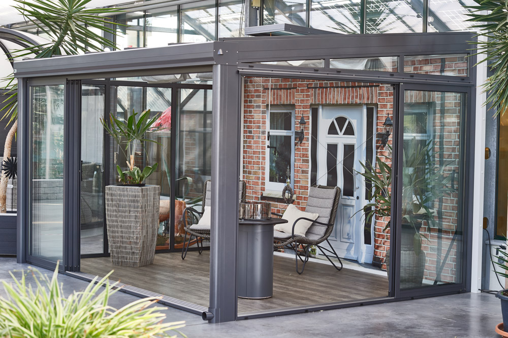 Im wärmegedämmten Dachsystem aus Aluminium sind Fenster eingebaut. Der Weg in Ihren Garten führt durch eine leichtgängige Mehrfachschiebetür, die Sie abschließen können. So dient das Häuschen als gemütlicher Aufenthaltsort für Sie und Ihre Lieben – bei Sonne, Regen oder wolkenverhangenem Himmel.