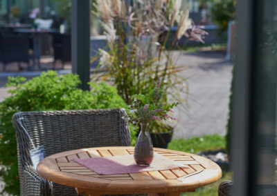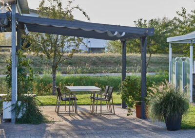 für die Terrasse gut geeignet. Sie ist langlebig, stabil und pflegeleicht. Die integrierten Regenwasserfallrohre in den Stützen leiten das Wasser an nassen Tagen zuverlässig ab.