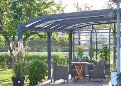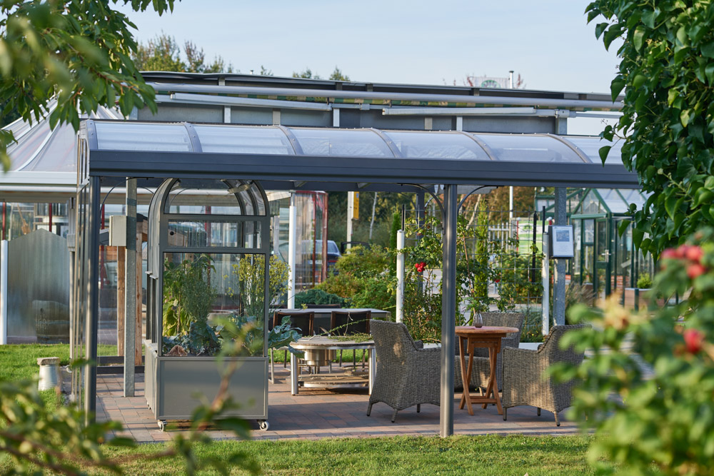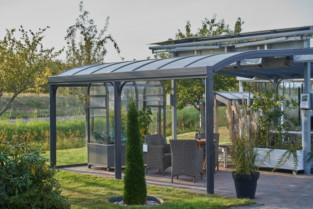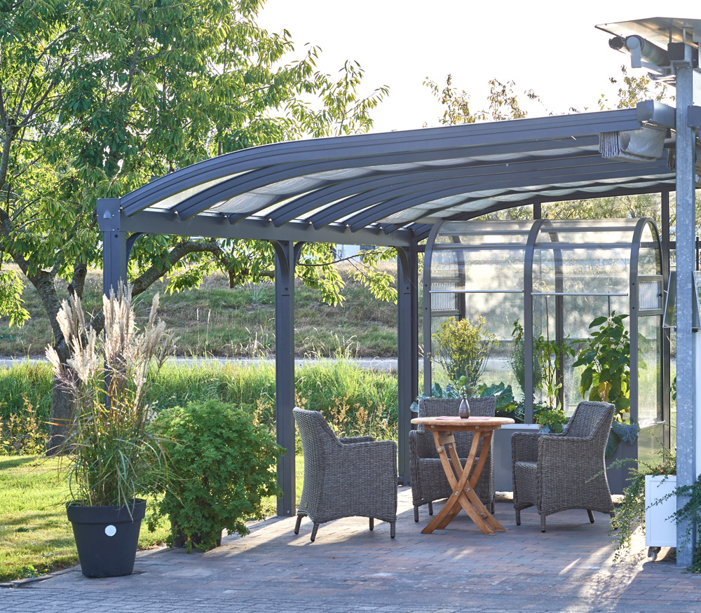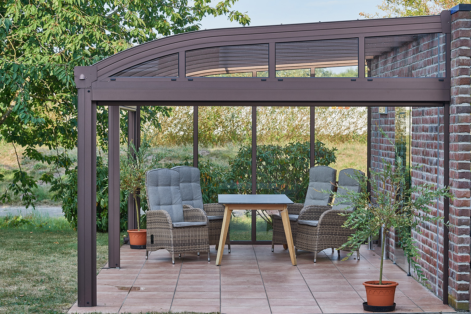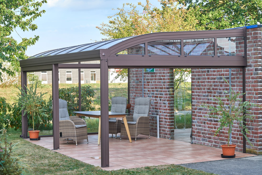 Als Alternative zur Markise ist diese Überdachung in moderner, gewölbter Form