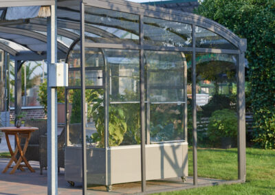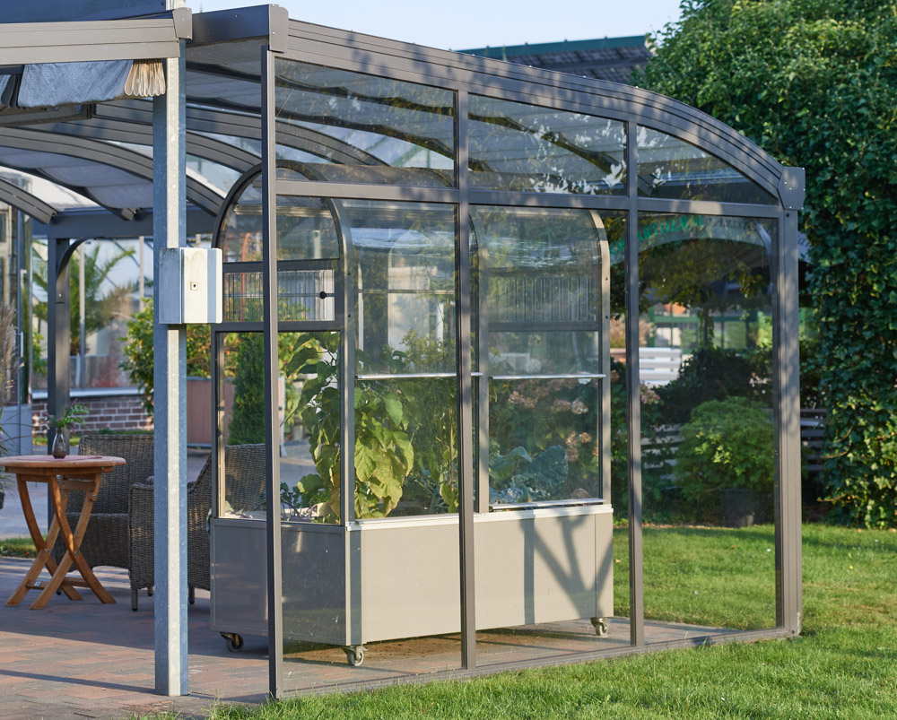 Tauschen Sie Ihre Markise gegen diese langlebige Überdachung aus. Sie ist aus festen Aluminiumprofilen gefertigt, zwischen denen beständige Glasflächen sitzen. Das pflegeleichte Material hält wechselnden Witterungsbedingungen mühelos stand.
